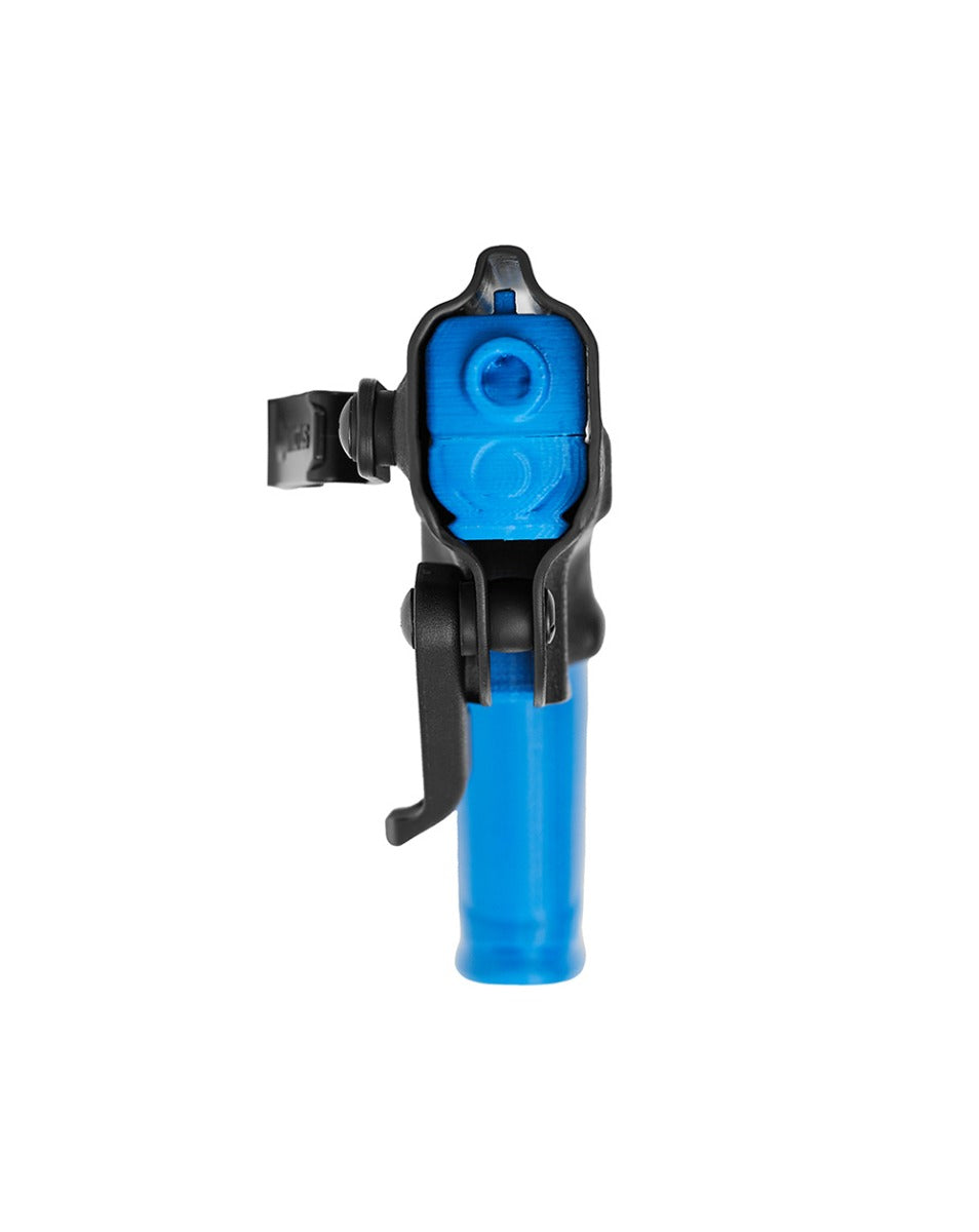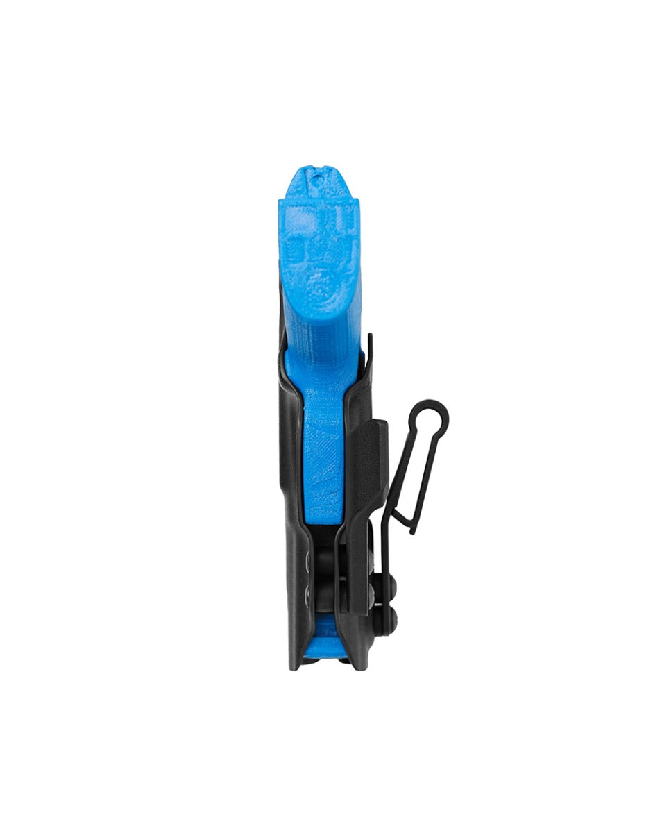 O Kydex® não deforma, não propaga chamas e é extremamente resistente ao impacto. Com duas opções de clip, um em polímero (POM), muito resistente, e outro clip metálico em aço inoxidável, com ajuste de ângulo. Ambos os clips possuem regulagem de altura.